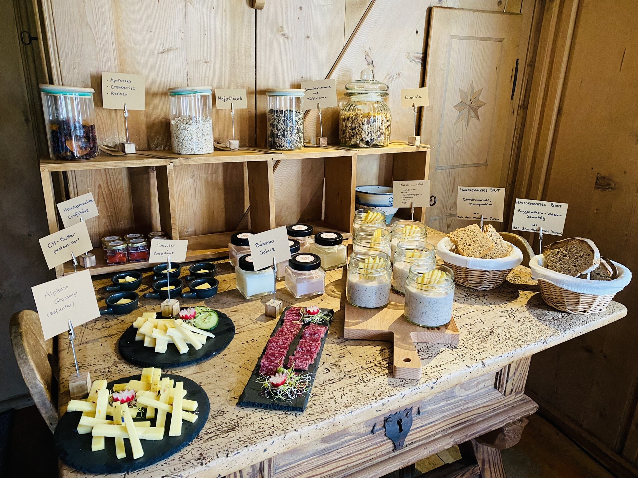 Wer bei uns eine Übernachtung bucht, der wird morgens am Frühstücksbuffet mit selbstgebackenem Brot und regionalen Produkten aus dem Safiental verwöhnt. Milchprodukte, Fleisch, Honig und Konfitüre stammen allesamt aus dem Tal und tragen somit zum authentischen kulinarischen Erlebnis bei. Den kürzesten Transportweg haben wohl die Eier, welche von den Nühus-Hühnern jeden Tag frisch gelegt werden.