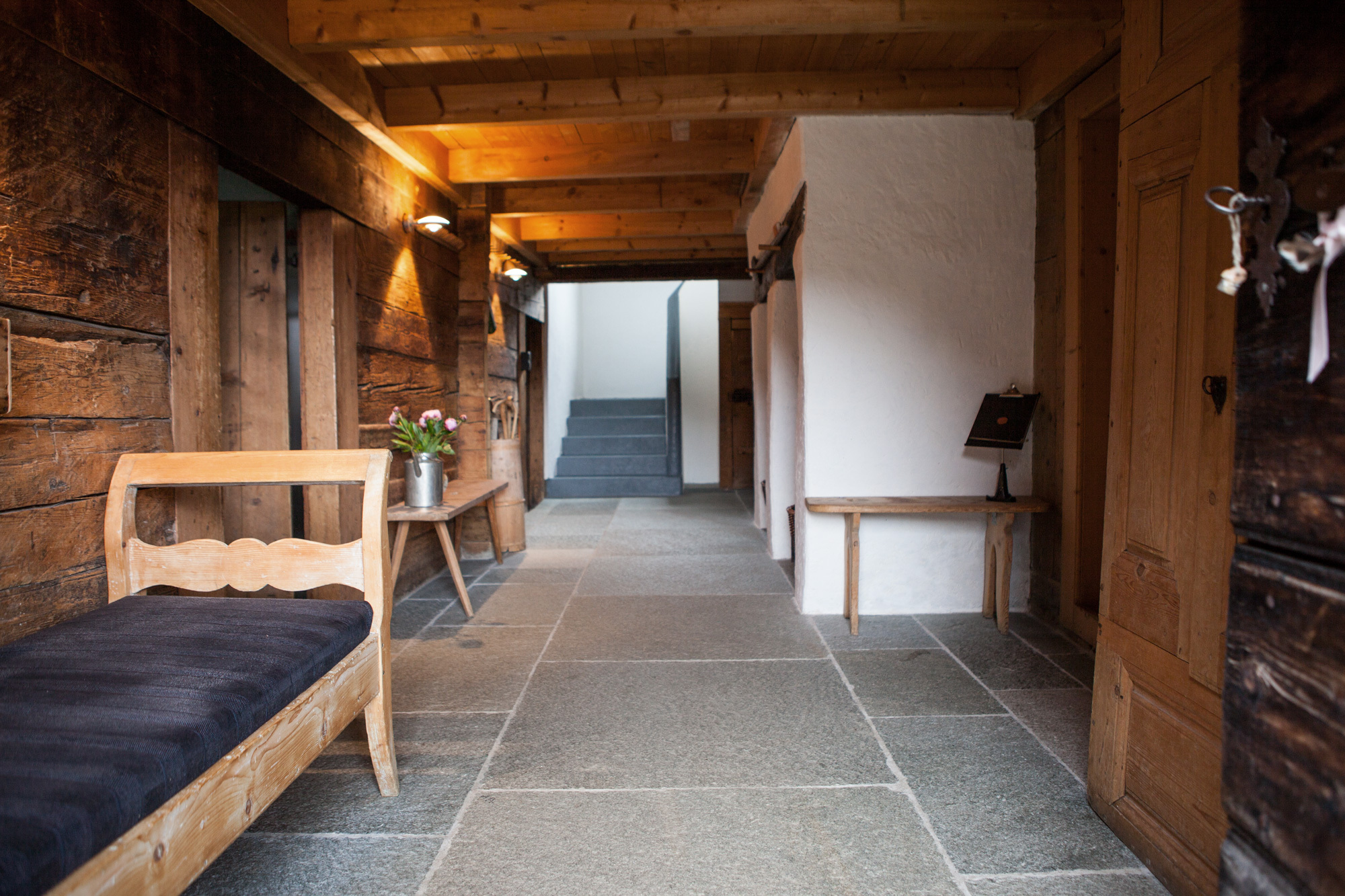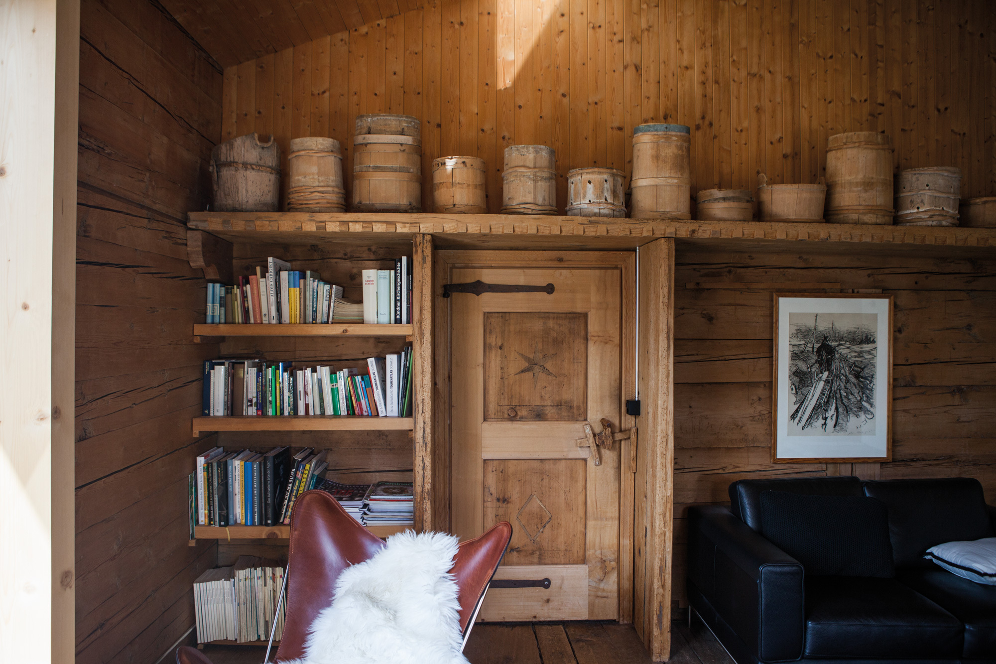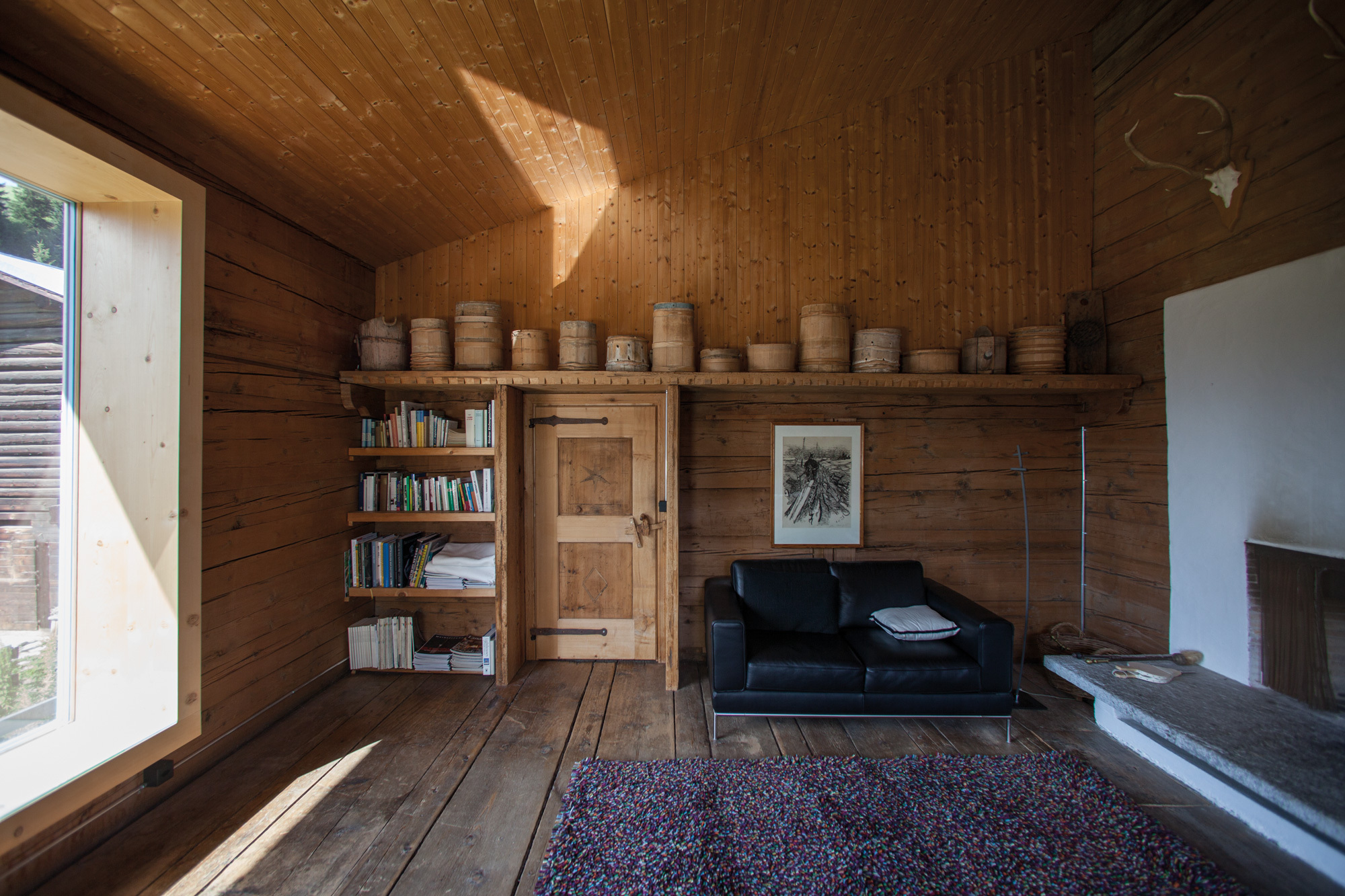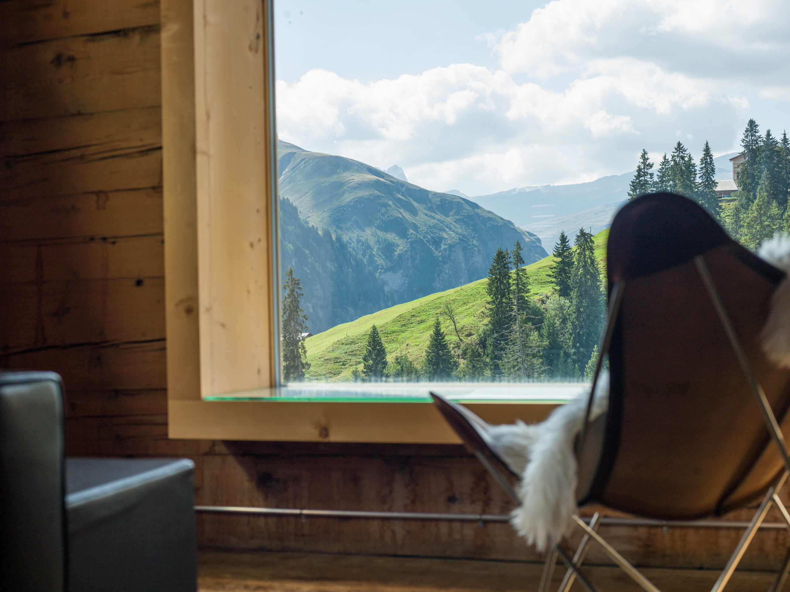 Prunkstück und Herz des Hauses ist der grosse Aufenthaltsraum, der zum Verweilen einlädt. Im Winter brennt im Cheminée von Rudolf Olgiati ein gemütliches Feuer. Durch das grosse Panoramafenster sieht man das Bruschghorn und den Camaner Grat.