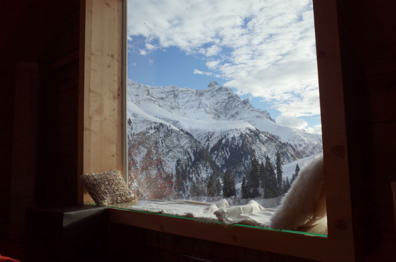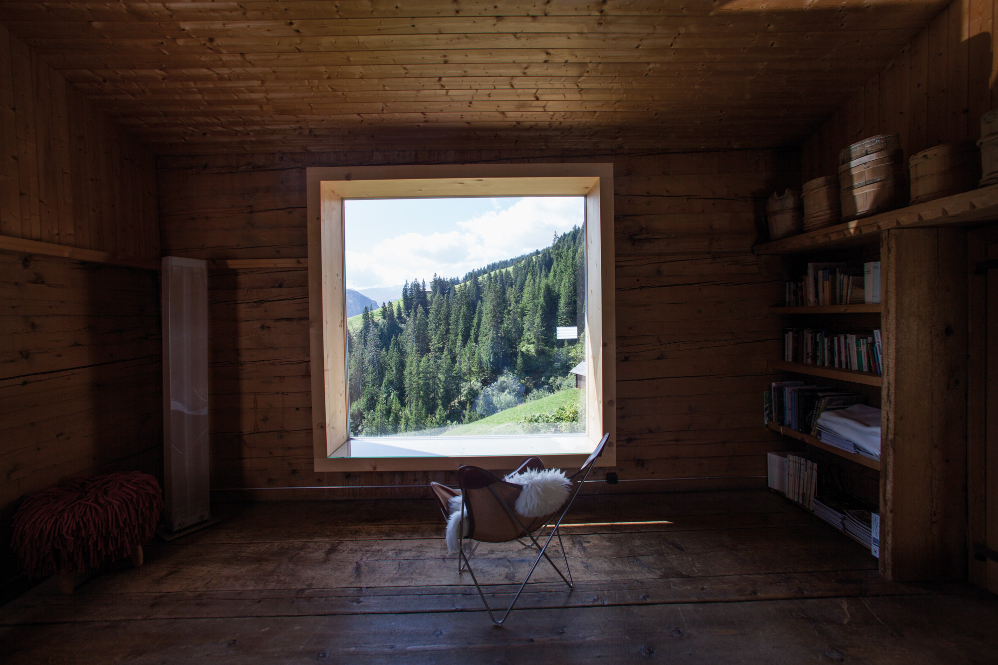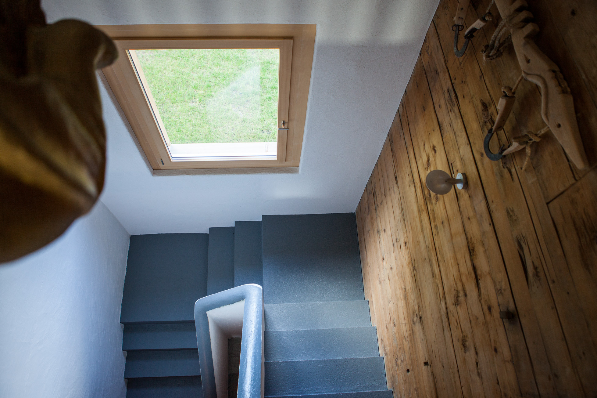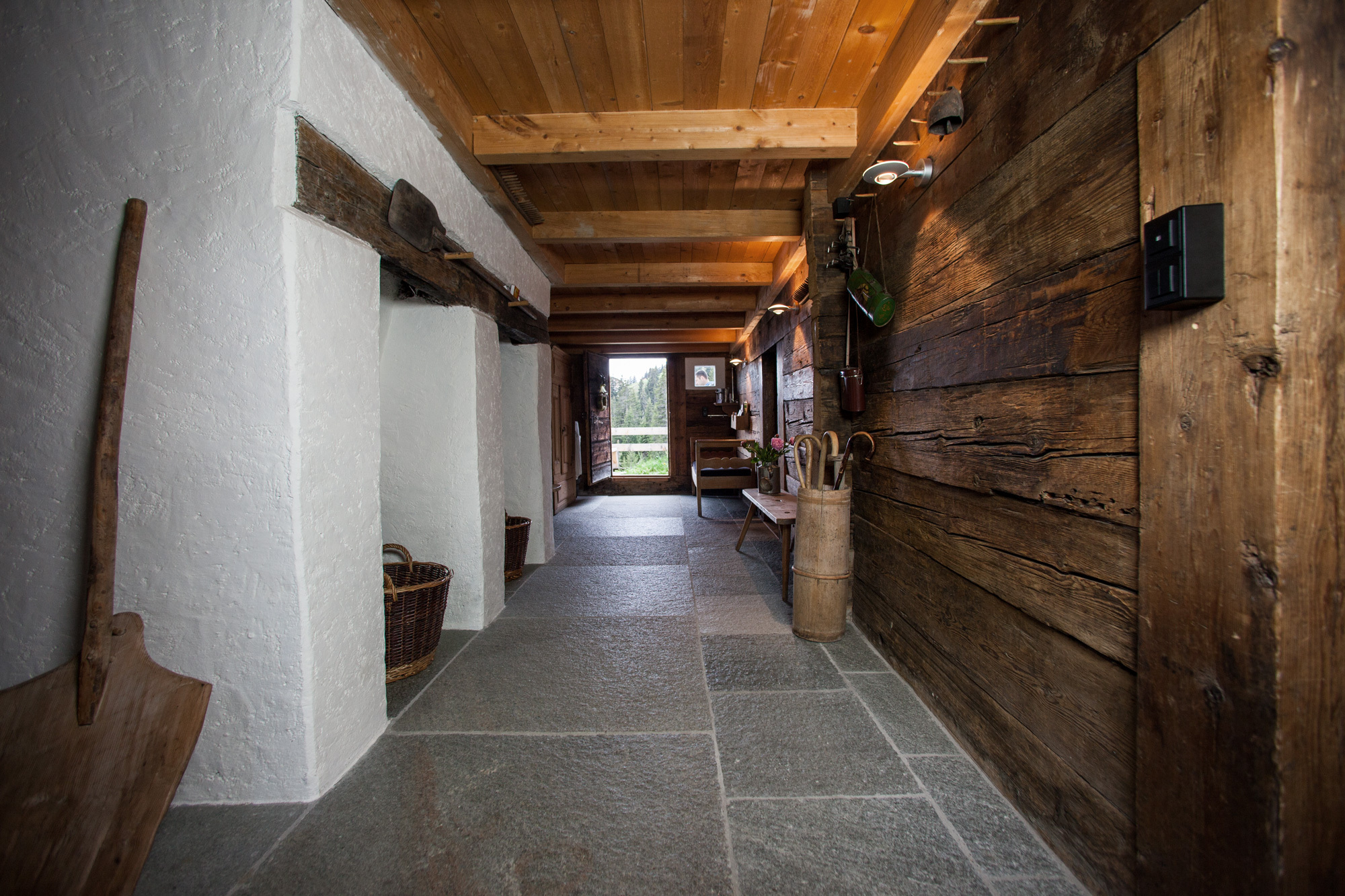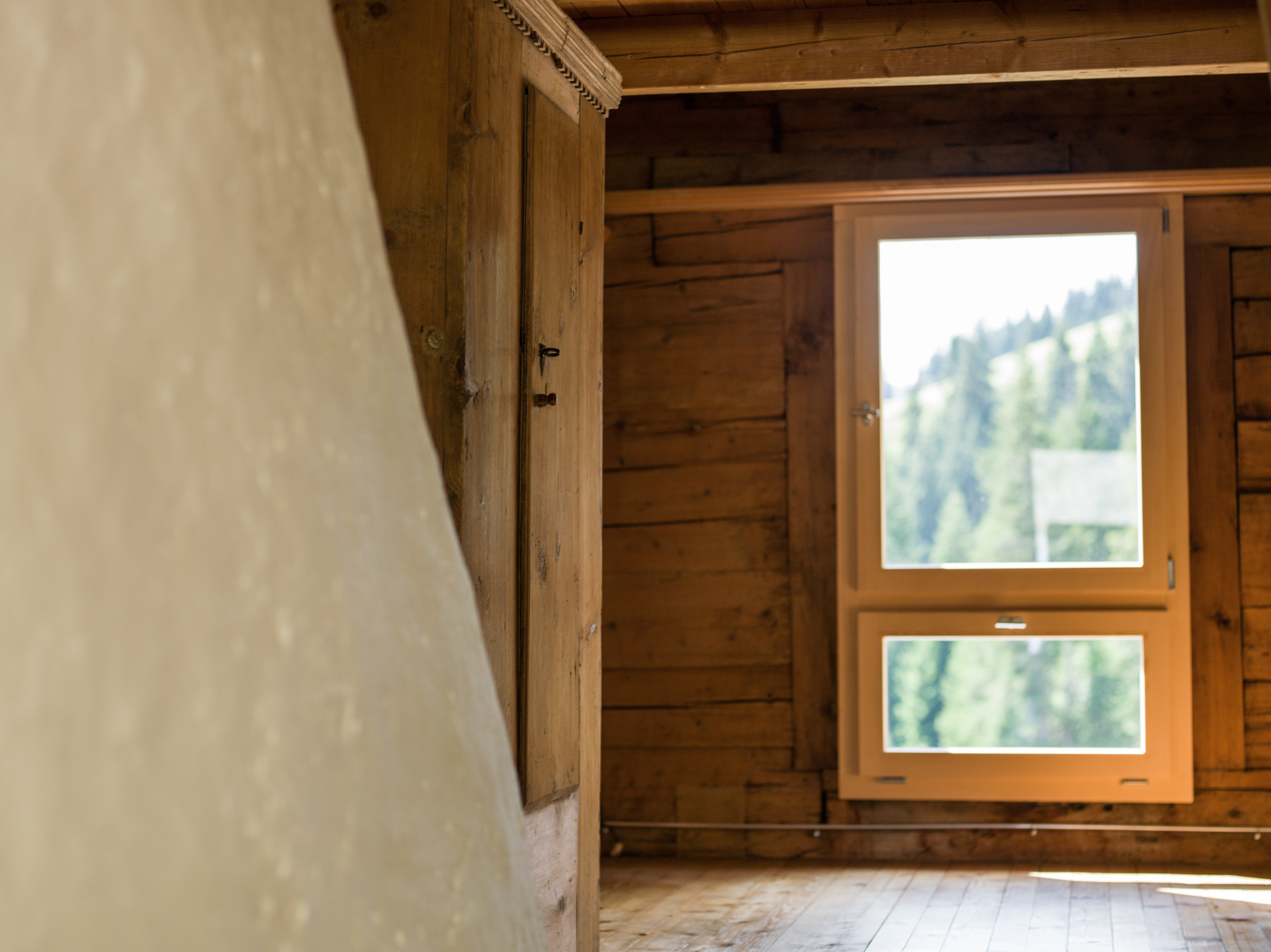 Prunkstück und Herz des Hauses ist der grosse Aufenthaltsraum, der zum Verweilen einlädt. Im Winter brennt im Cheminée von Rudolf Olgiati ein gemütliches Feuer. Durch das grosse Panoramafenster sieht man das Bruschghorn und den Camaner Grat.